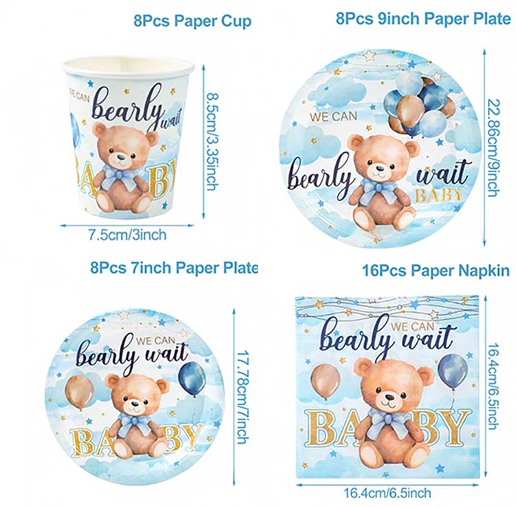 Величина сета плоча за једнократну употребу за рођендан за бебе: Производ је упакован у ОПП кесе, али је такође доступно паковање папирних картица. Можемо прилагодити паковање према специфичним захтевима купца.