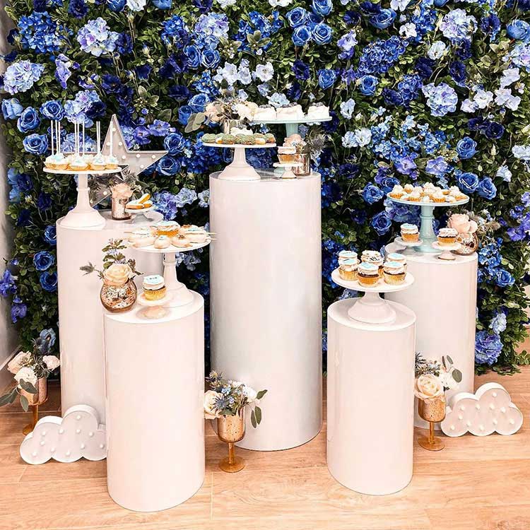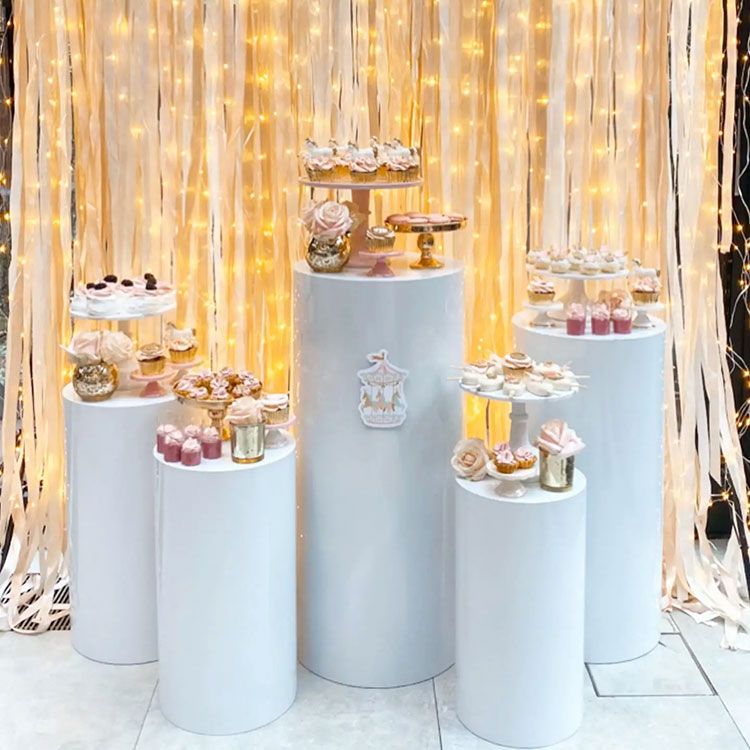 Десертни сто цилиндричне основе служи и као контејнер и као украс. Обично долазе у различитим комбинацијама: 3-делне комбинације, 5-делне комбинације, 7-делне комбинације и тако даље. Најчешћа комбинација је пет комада. Независне цилиндричне цеви различитих величина могу се флексибилно распоредити и важан су део сцене. Истовремено, нудимо и прилагођавање величине и облика. Штавише, слажу се са вашом декорацијом за забаву.