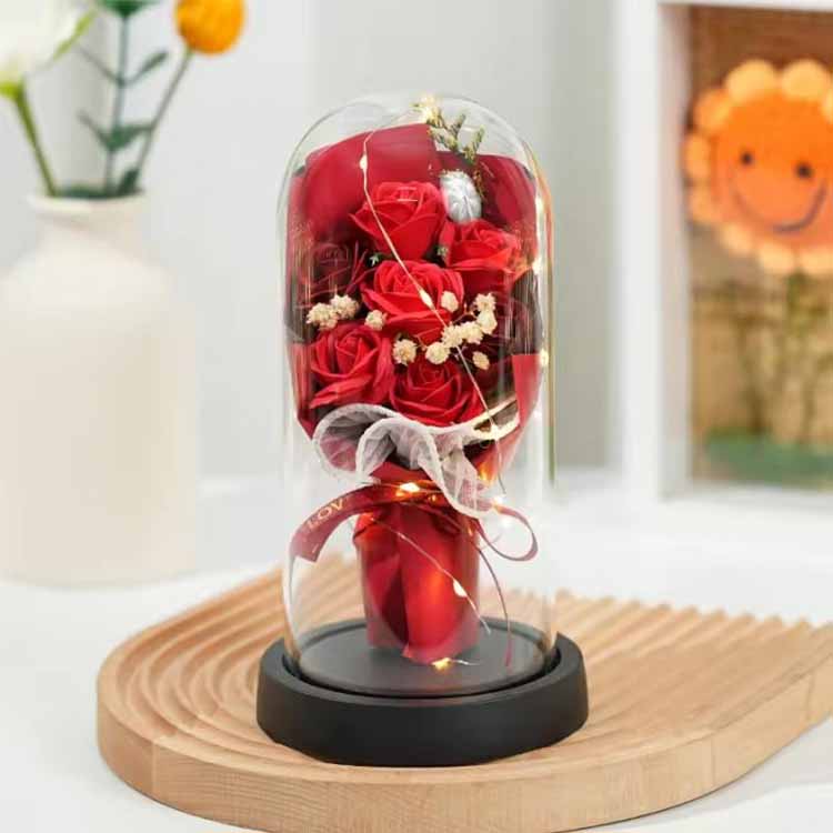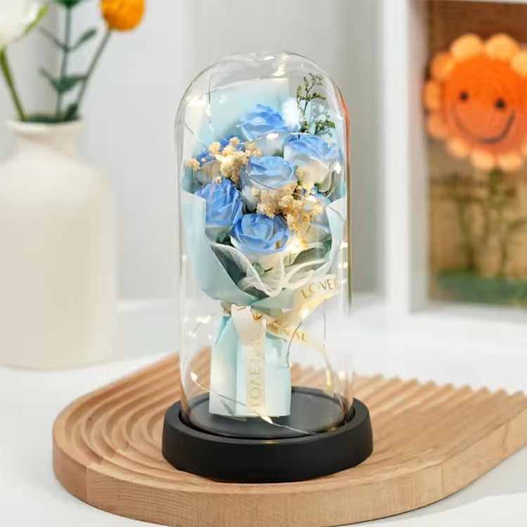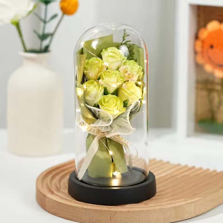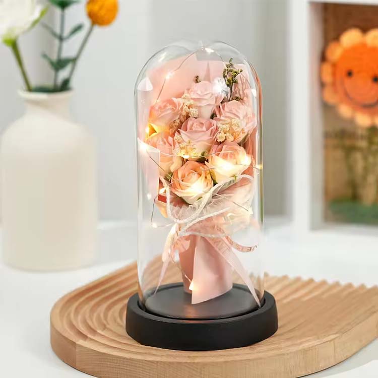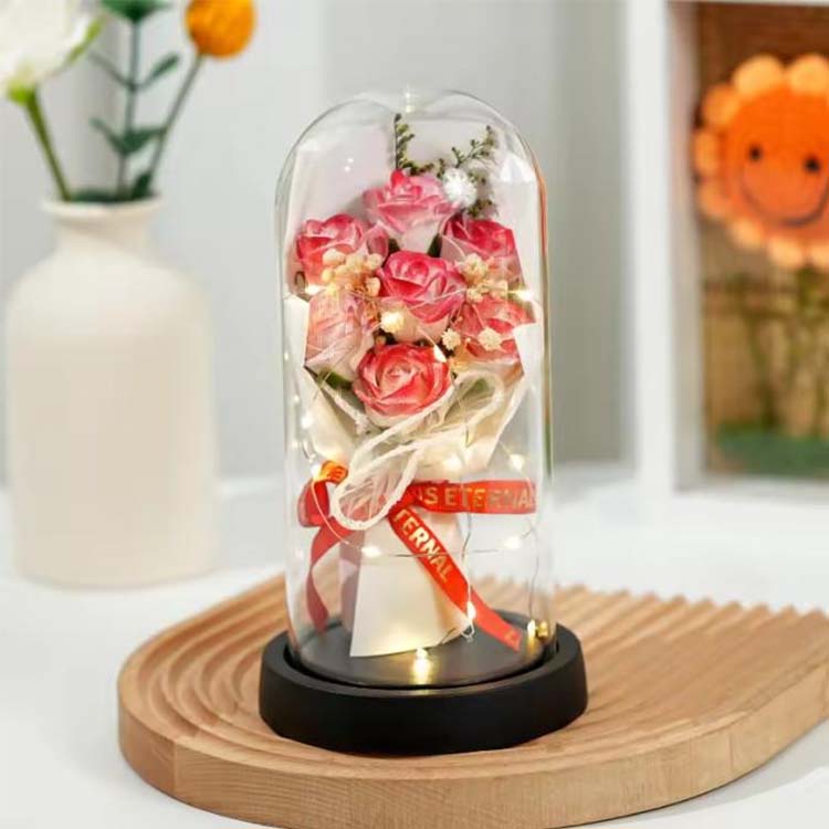 Букет ружа од сапуна са стакленом куполом са ЛЕД-ом се користи у комбинацији са цвећем сапуна и очуваним цвећем. ЛЕД светла користе топлу и не блиставу светлост, која може да дода топлу атмосферу приликом украшавања сцена. Уграђени ЛЕД светлосни низ такође има шарена трепћућа светла, а боје се могу прилагодити вашим потребама. Овај букет са стакленим поклопцем и конзервираним цвећем, може се користити за постављање сцена за рођење, као што су предлоги за постављање рођендана итд. такође може бити поклоњено. Вечно цвеће неће увенути и неће променити боју чак ни под стакленим поклопцем. Цвеће сапуна се такође може користити за прање руку или као мирис. Овај букет ружа је економичан и практичан.