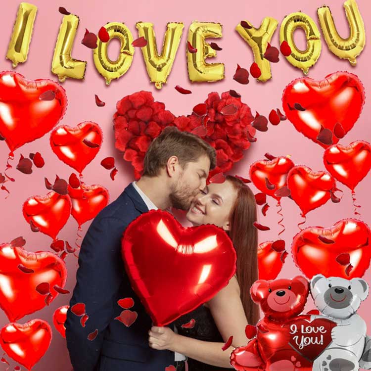 Фолирани балони за Дан заљубљених имају слатке слогане попут „Волим те“ и „Срећан Дан заљубљених“. Балони се испоручују у живописној црвеној, розе и златној фолији, стварајући тродимензионални ефекат када су надувани. Визуелно представљају романтичну празничну атмосферу. Поред слогана, долазе иу разним облицима, као што су руже, медведи који грле срца, усне, између многих других. Можете бирати на основу специфичног амбијента и стила.